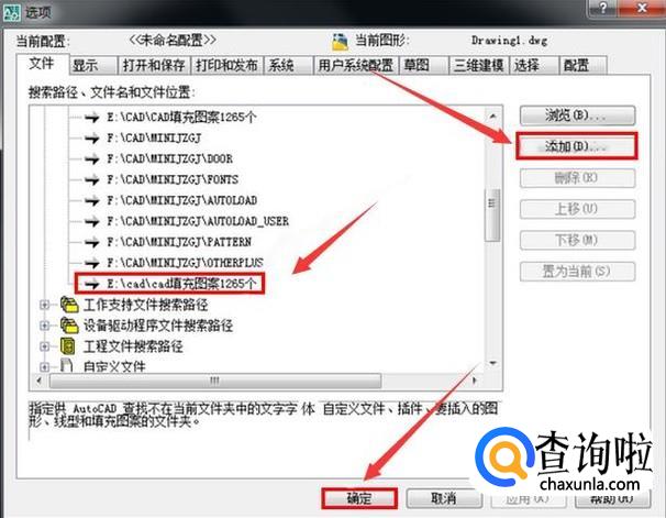 点击支持文件搜索路径选项在其内找到我们的填充图案,然后再找到添加选项,之后点击确定我们就将图案加载进来了,如图所示: