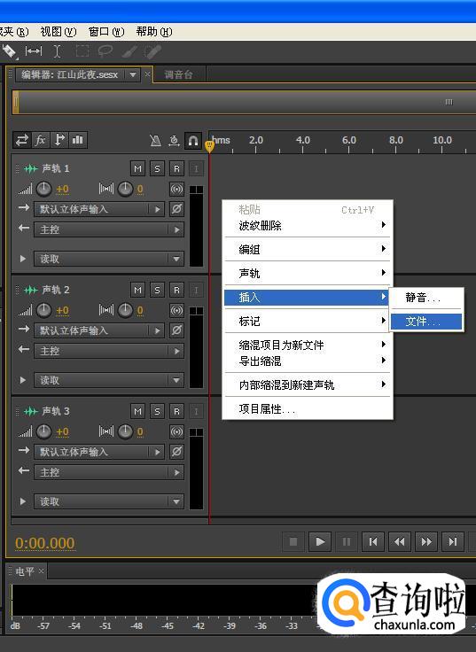 我们在第一条音轨里(音轨1),点击“右键-插入-文件”,如下图所示。
