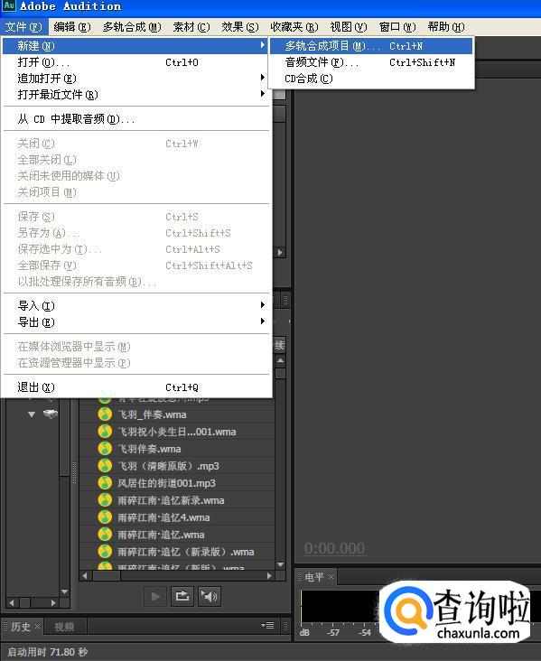打开Adobe Audition录音软件界面,点击“文件-新建-多轨合成”,如下图所示。