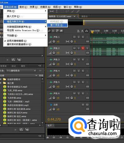 接着我们需要把整个文件进行混缩处理,合成一个新的音频文件呢,因为伴奏是伴奏,人声干音是干音,文件都还是独立的,要把它们进行合成,融为一体,变成一个独立的文件才行。