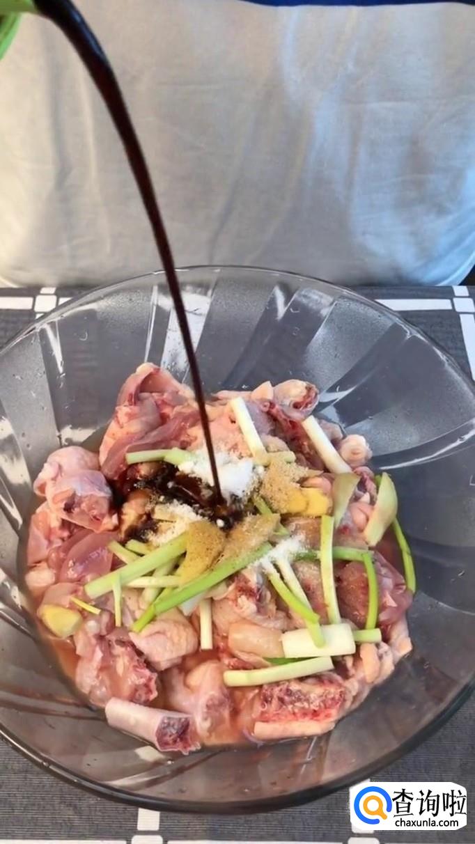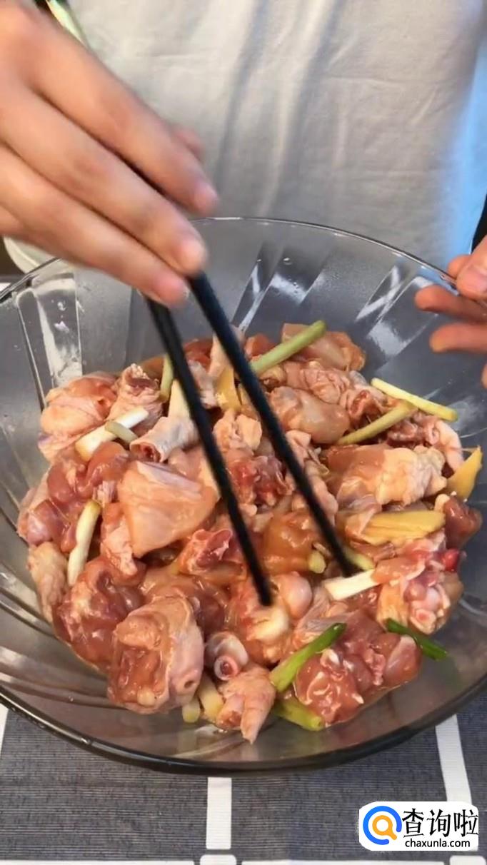 接着把鸡肉放到容器当中,并加入适量的生姜和葱段且滴入几滴香油,如下图所示。