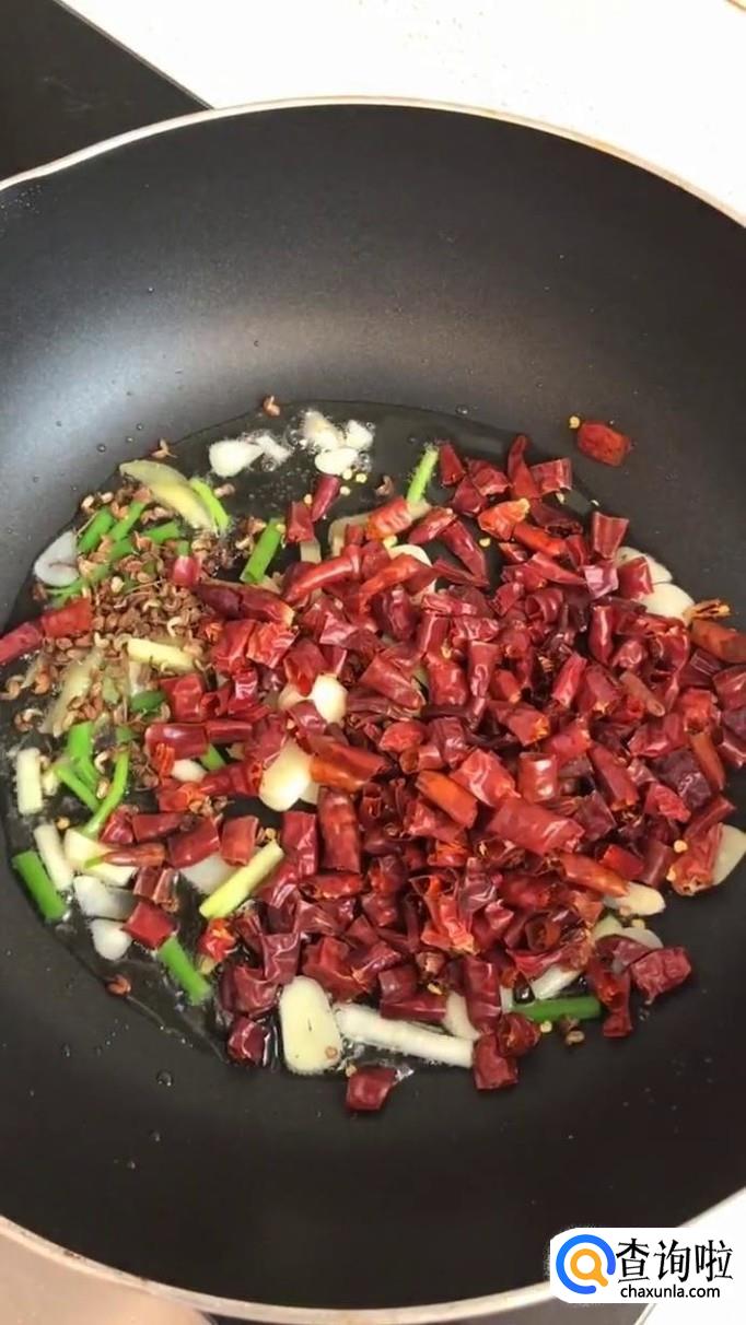 接着往锅中加入适量的食用油,待油冒烟,倒入干辣椒,蒜头和葱段爆香,如下图所示。