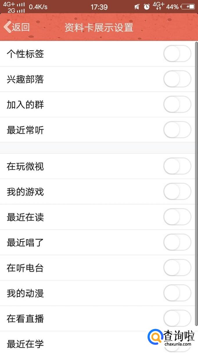 最后,滑动到最底端,点击资料卡显示设置,将所有的东西点击关闭即可。
