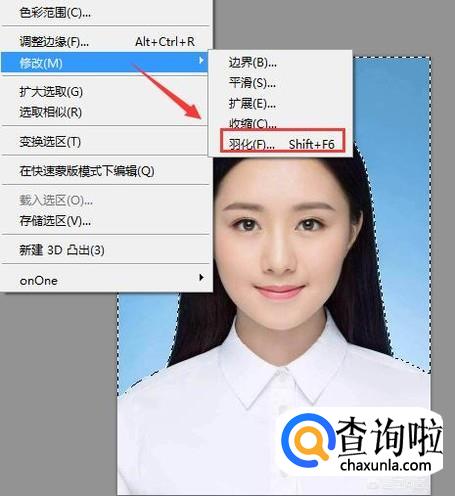 得到背景选区之后我们在选择菜单里找到修改,然后在修改里找到羽化选项,如图所示: