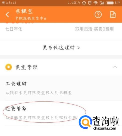 进入余额宝后,在中间的位置,找到资金管理下的还贷管家