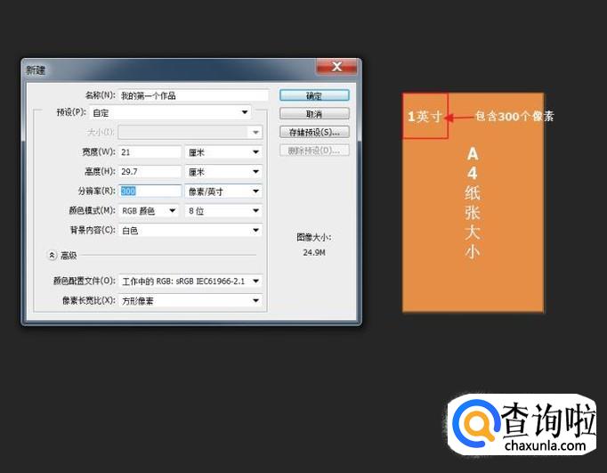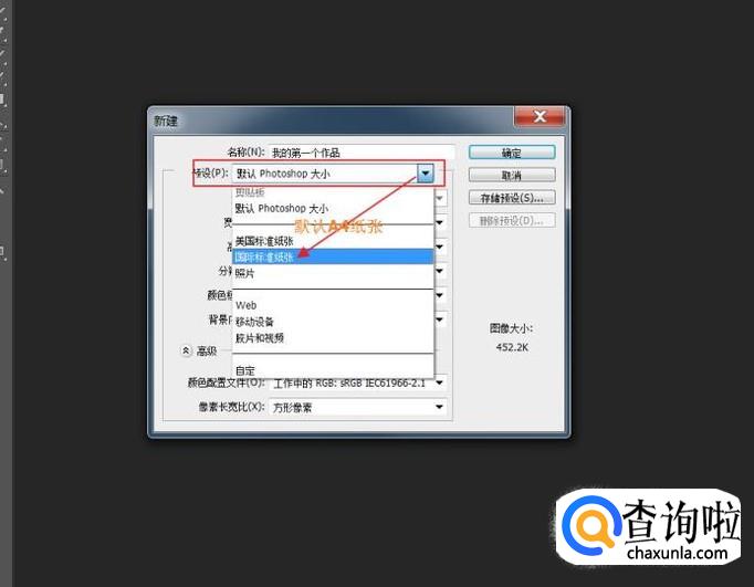 默认情况下Photoshop会提供一些常用的预设,这里我们可以将预设设为:“国际标准纸张”选项。