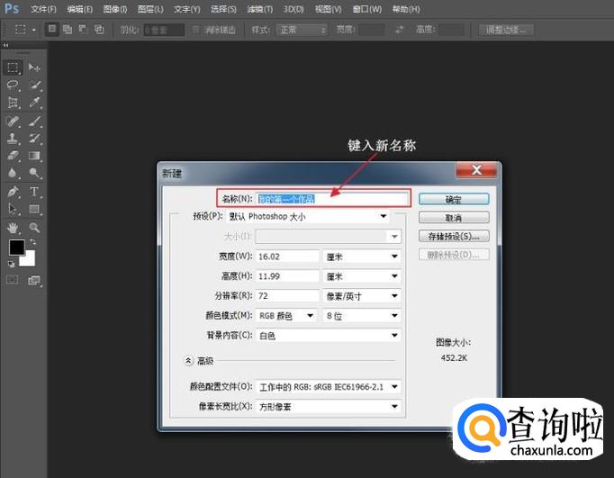 在弹出的新窗口,初学者可能会有点蒙,这里我们首先为新的文档起一个合理的名称,例如:我的第一个作品。