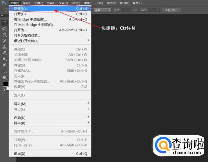 我们在刚打开PS时,如果需要开始一个新的工程则需要执行:“文件>新建”命令,以便快速建立新的文档。