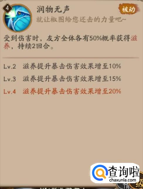 椒图是一个非常给力的辅助,三技能涓流能平摊伤害,还能减免5%的伤害,二技能润物无声能给队友提升5%(基本)的暴击伤害,在秘闻副本和结界突破中作用巨大,可谓是R卡的常青树啊。