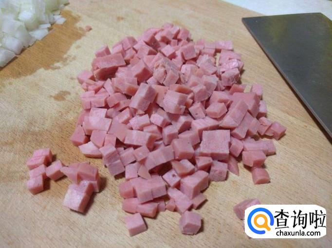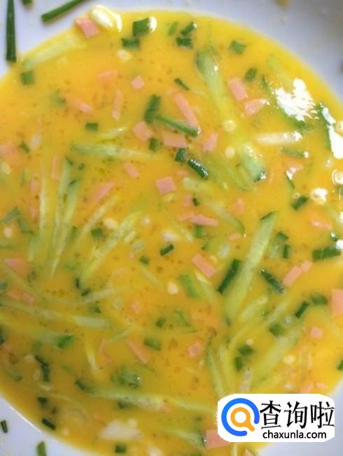 然后把火腿丁,黄瓜丝,鸡蛋倒入碗中,加入适量的盐,味精等调料搅拌均匀
