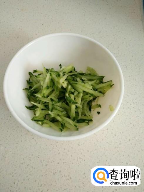 黄瓜洗净后,然后用擦丝器擦成丝备用,然后用刀剁剁碎备用
