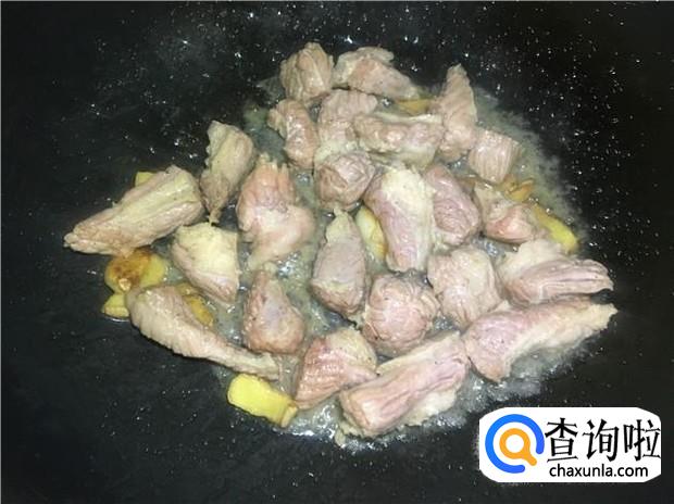 热锅下油,放入姜片煸香,然后倒入腌制好的牛腩,先小火煎几分钟牛腩。
