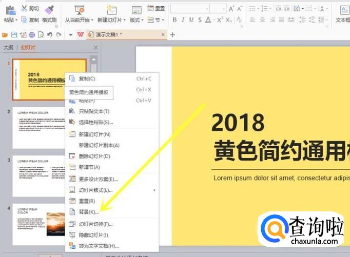 然后选择一张PPT,点击鼠标右键弹出设置窗口,然后再用鼠标左键点击 背景