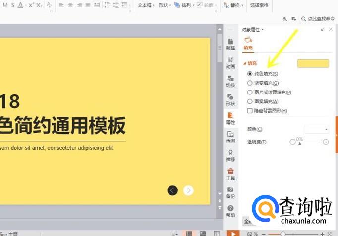 接着就会在ppt的右边弹出背景设置窗口,我们可以选择不同的颜色对ppt进行纯色填充