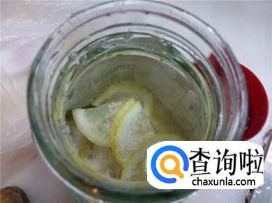 柠檬洗净,切成片,然后,一片片放进容器中。