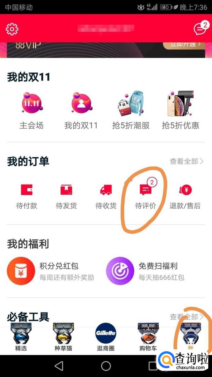 首先,我们打开我们手机上的天猫软件,然后我们点击我,之后我们点击待评价;