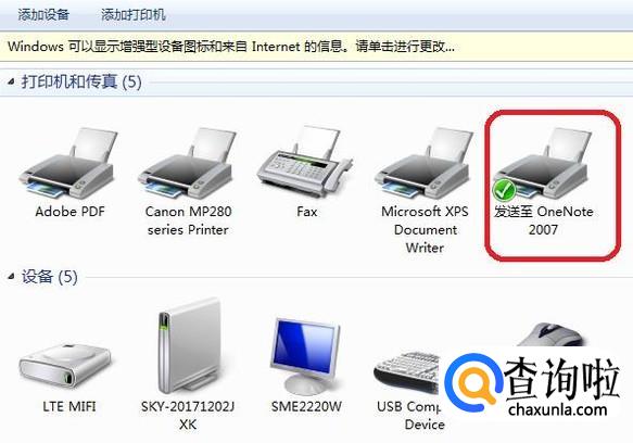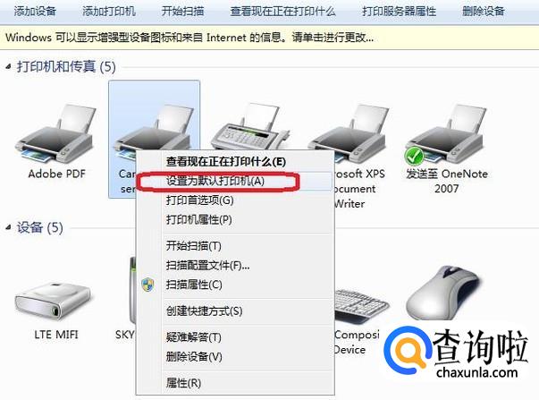 可以看到,此时的默认打印机就是“发送至 One Note 2007”,我们在正确的打印机上右键点击,选择“设置为默认打印机”,就设置好了。