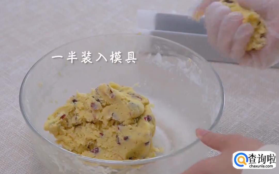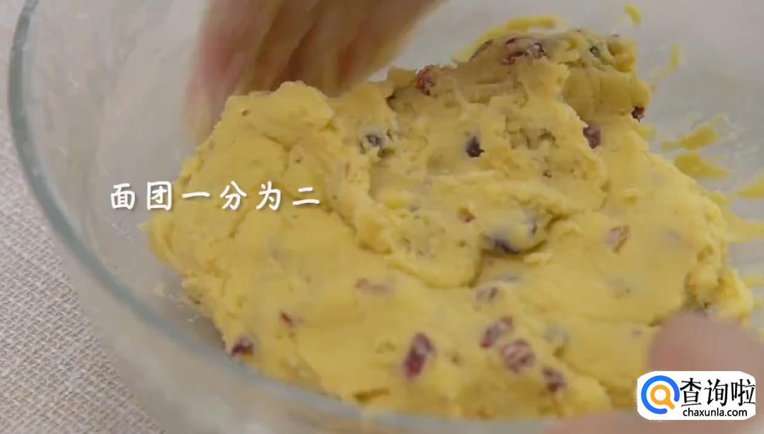 筛入110克低筋面粉,加入蔓越莓坚果碎,拌匀,这样曲奇面团就做好了。因为这里要教大家做两种口味(原味+抹茶)的曲奇,所以需要先将面团一分为二。