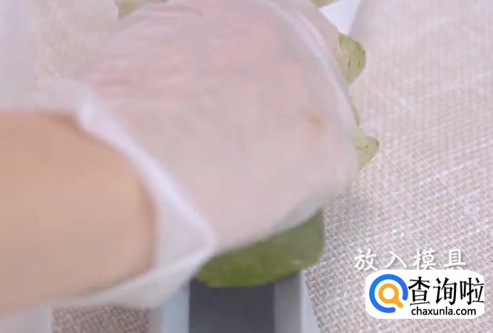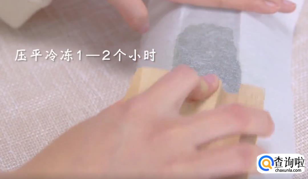 接下来做抹茶味的:在另一半原味面团中筛入抹茶粉揉匀;揉匀后放入提前放好烘焙纸的模具中塑形、压平,取出放入冰箱中冷冻1-2小时。