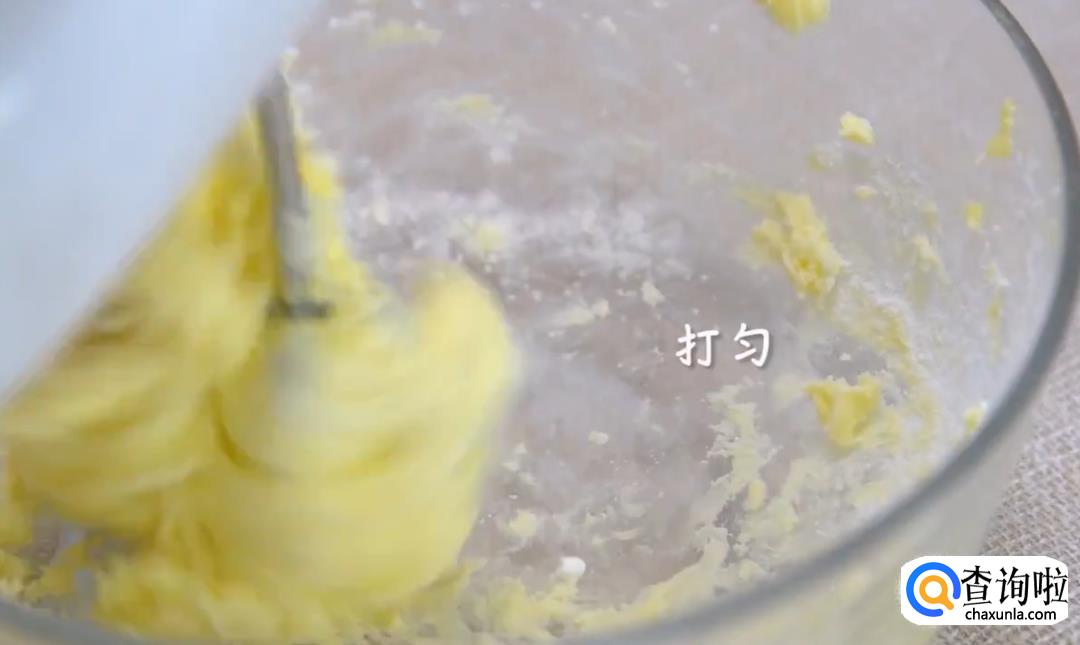 将黄油放入碗中,先用电动打蛋器将其打化;加入糖粉50克,用电动打蛋器将黄油和糖粉打匀至完全融合;再分两次加入鸡蛋液(每次7ml),每加一次都要用电动打蛋器打至均匀。