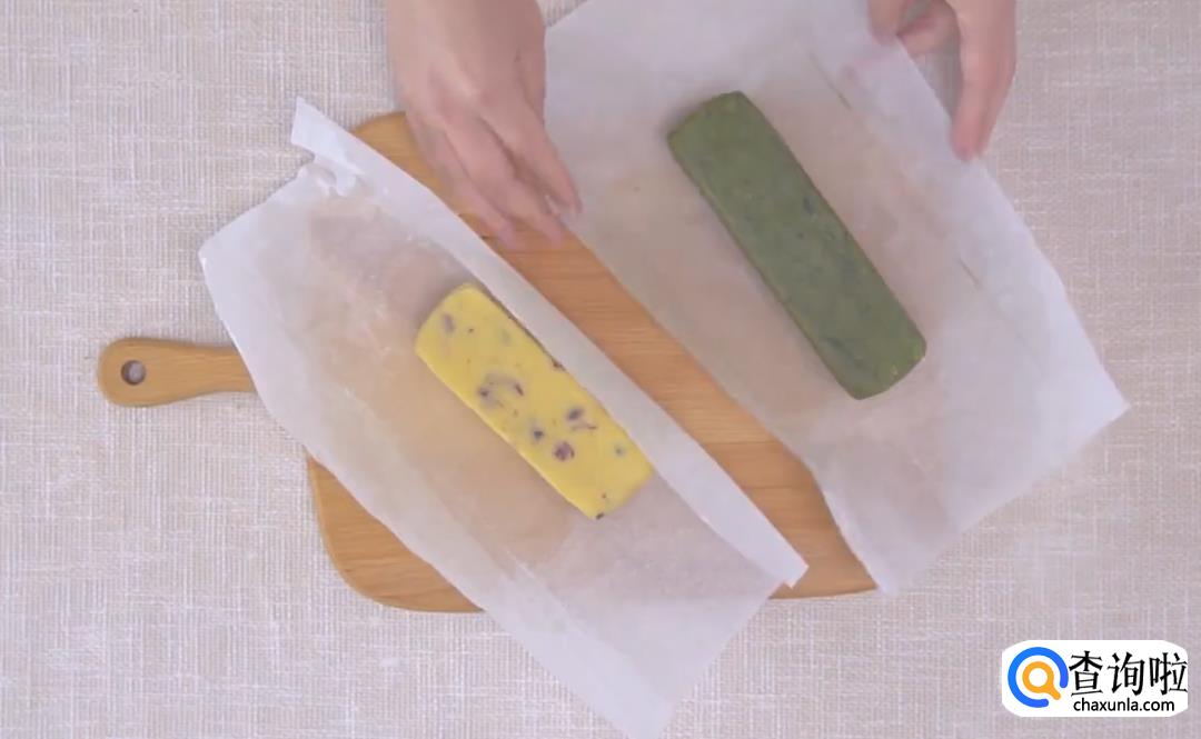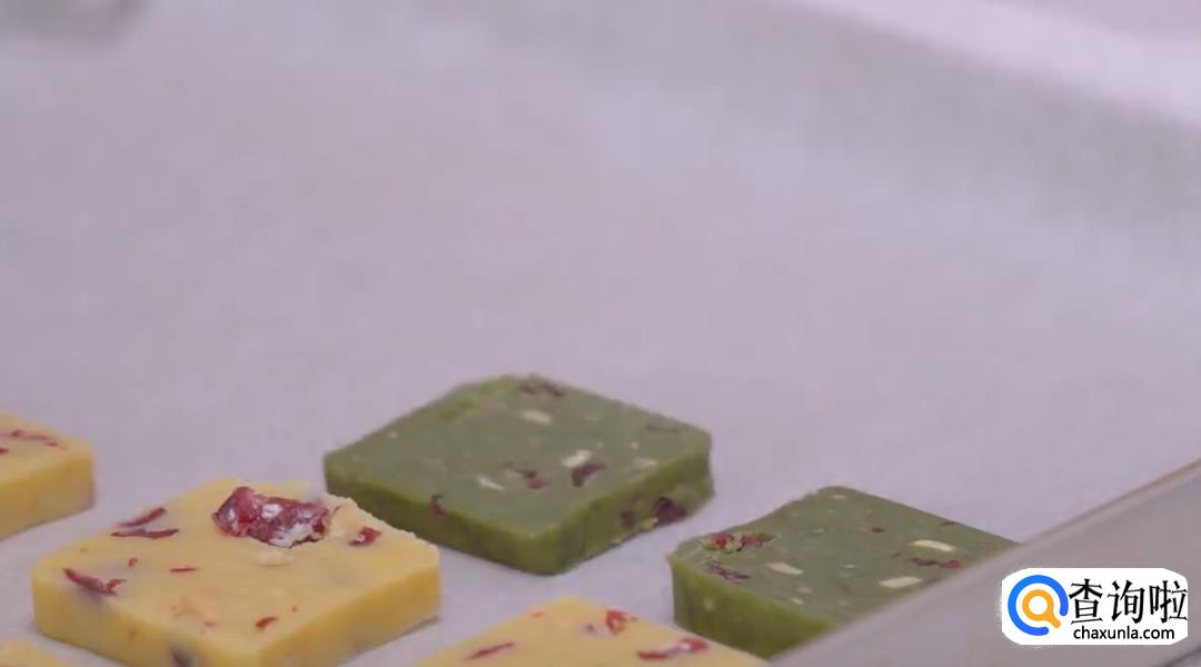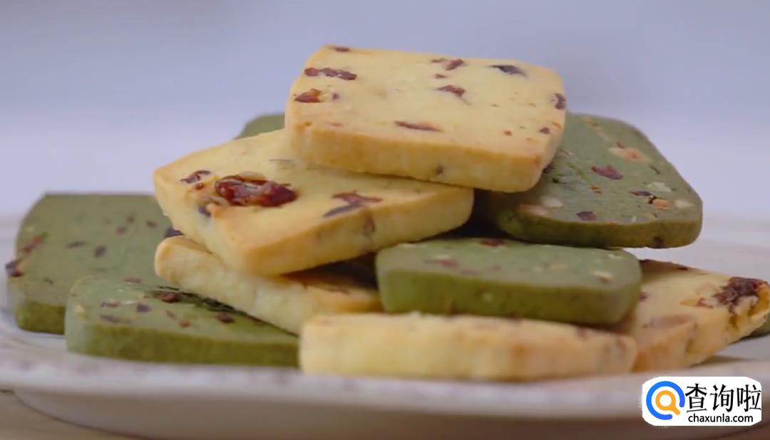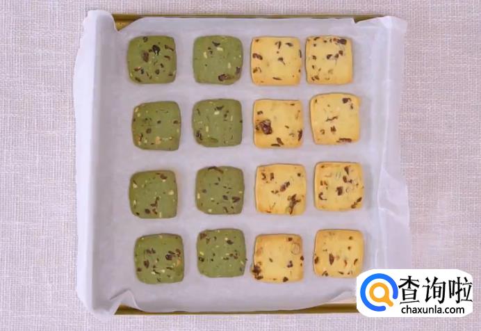 冷冻时间到后,将原味面团和抹茶味面团从冰箱中拿出来,室温缓几分钟,切3-5毫米片;切好摆盘,送入提前预热好的烤箱;用上下火160度烤20分钟。