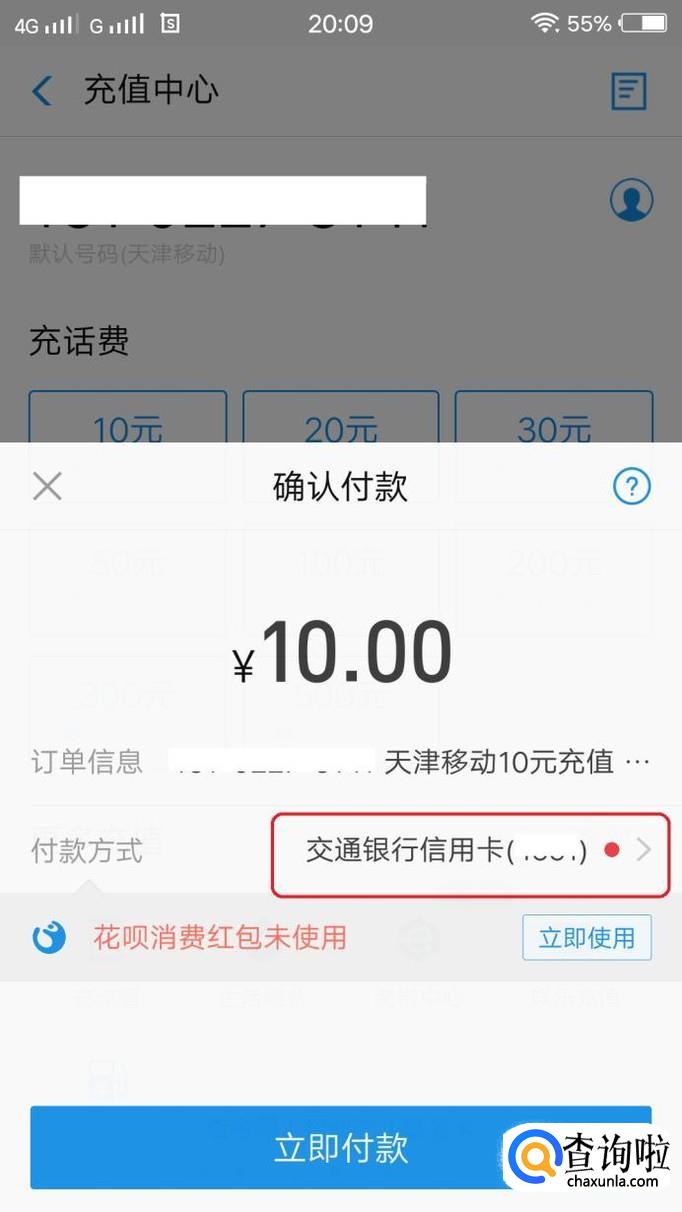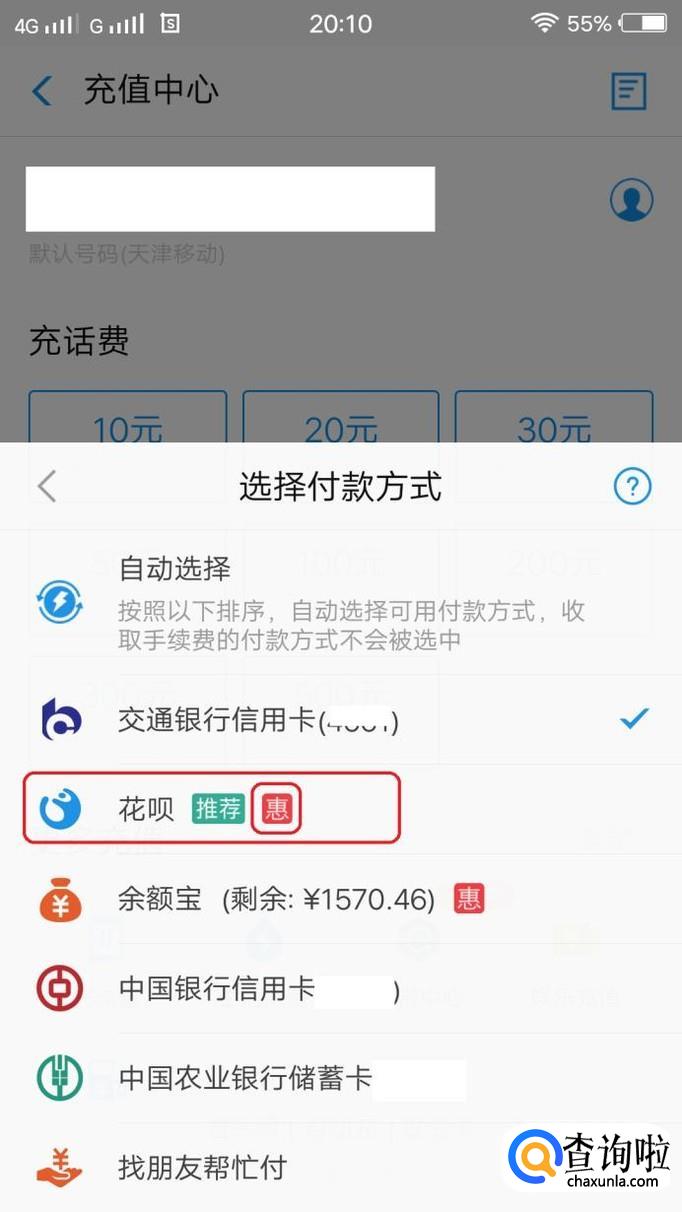 然后进入“选择付款方式”,我们看到“花呗”付款方式后面有一个红色的“惠”字,说明我们有花呗红包可以使用。我们选择“花呗”付款。