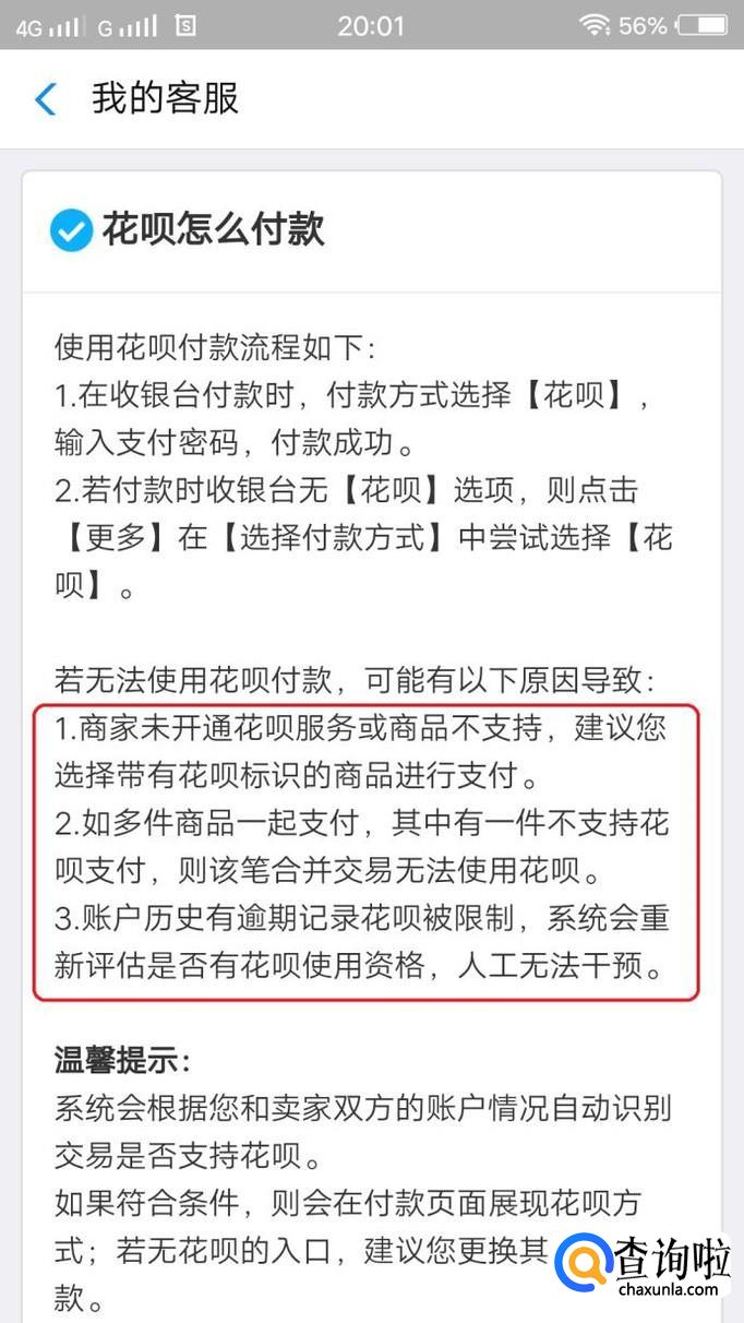 首先,我们打开支付宝,看看人工客服是如何解释付款时,花呗红包不能用的问题。我们看到,原因可能有三方面,如果花呗红包没有使用成功,请您对照这些原因,看是不是某一方面未符合要求。