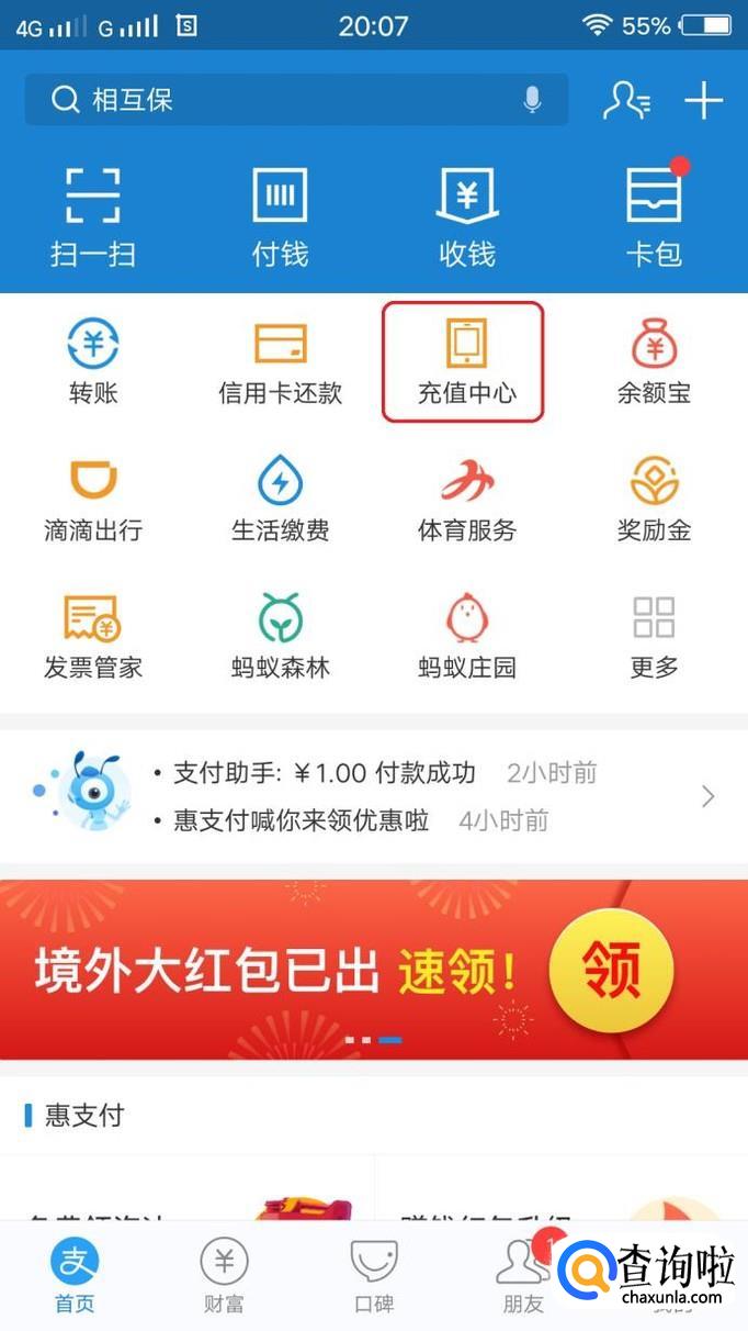 我们先选择一样商品,比如说,我打开支付宝,进入充值中心,用花呗红包充话费。