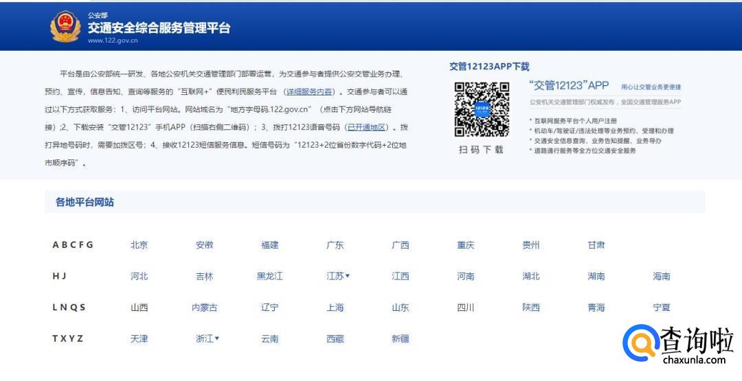 打开交通安全综合服务管理平台官方页面(http://www.122.gov.cn/),选中自己所在的省市。