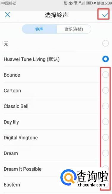 弹出的界面,我们根据我们的需求点击选中一个铃声,然后我们点击右上角的勾选就设置好了。还是比较简单的,相信大家现在都会了。