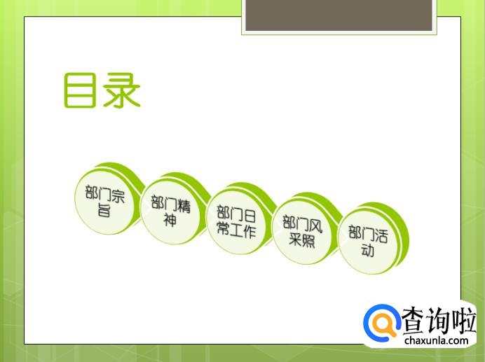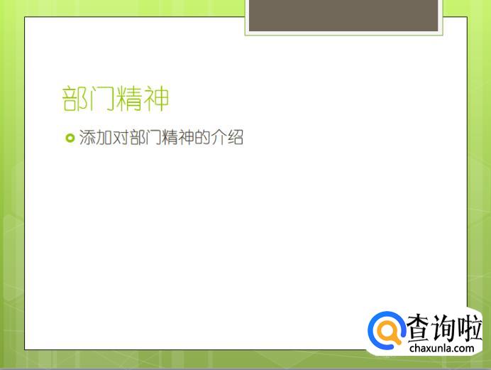 第五张PPT我们将其版式设置为为【标题与内容】,标题输入【部门精神】,内容添加对我们部门精神的介绍。