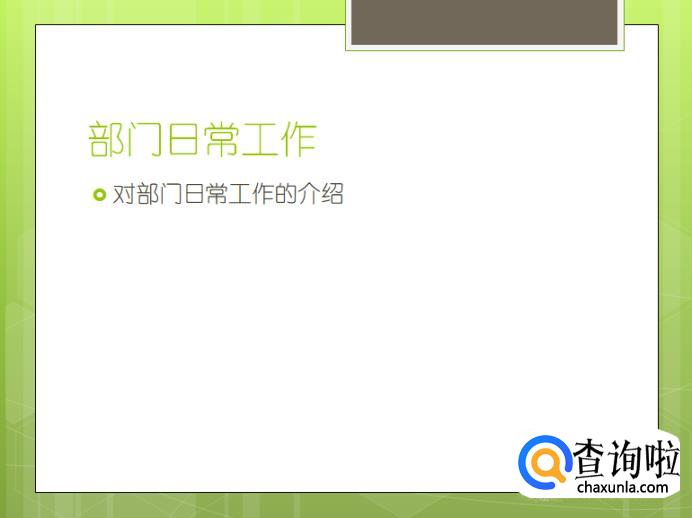 第五张PPT我们将其版式设置为为【标题与内容】,标题输入【部门日常工作】,内容添加对我们部门日常工作的介绍。