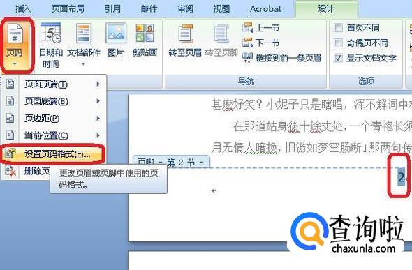 这时候生成的页码不一定是我们想要的,我们还需要设置一下,选中页码编号后,如图所示,点击“页码”,“设置页码格式”。