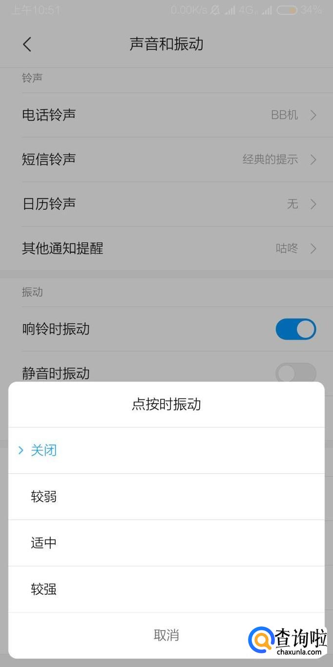 点击“点按时振动”设置选项还可以设置手机震动强度。