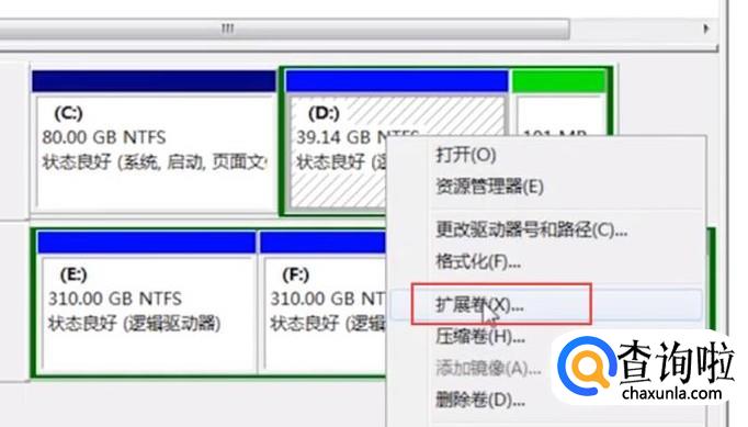 然后回到磁盘管理界面,右键单击压缩出来的空间,选择扩展卷,如下图所示