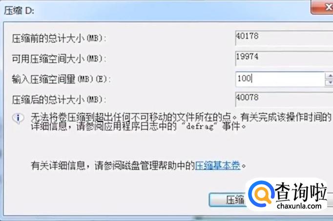 接下来在弹出的压缩卷的界面中设置一下压缩大小,如下图所示