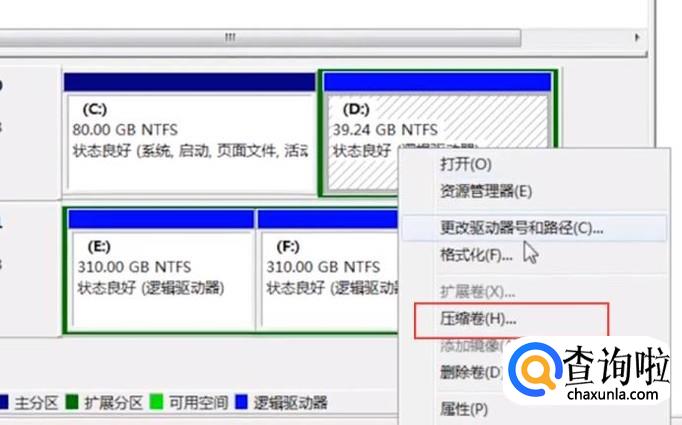 首先进入计算机管理界面,找到磁盘管理,右键单击D盘,选择压缩卷