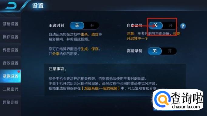 然后点击开启自由录像开关,如下图所示