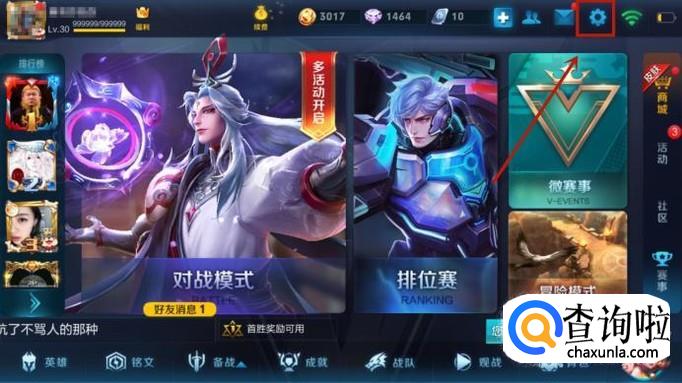 首先点击王者荣耀上方的设置按钮,如下图所示。