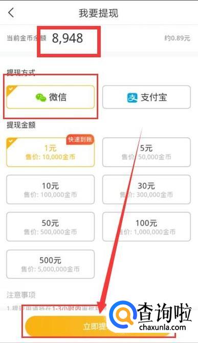 进入之后,当图示位置的金币达到10000时,提款方式选择“微信”,点击“立即提现”即可。