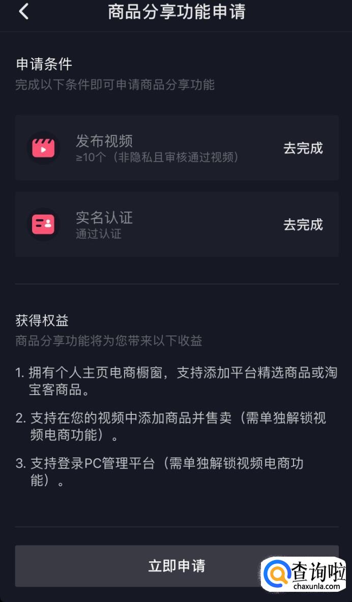 进入“商品分享功能申请”界面,此界面会显示申请的条件,若未完成申请条件则不能通过申请,若满足申请条件者则点击“立即审核”选项。