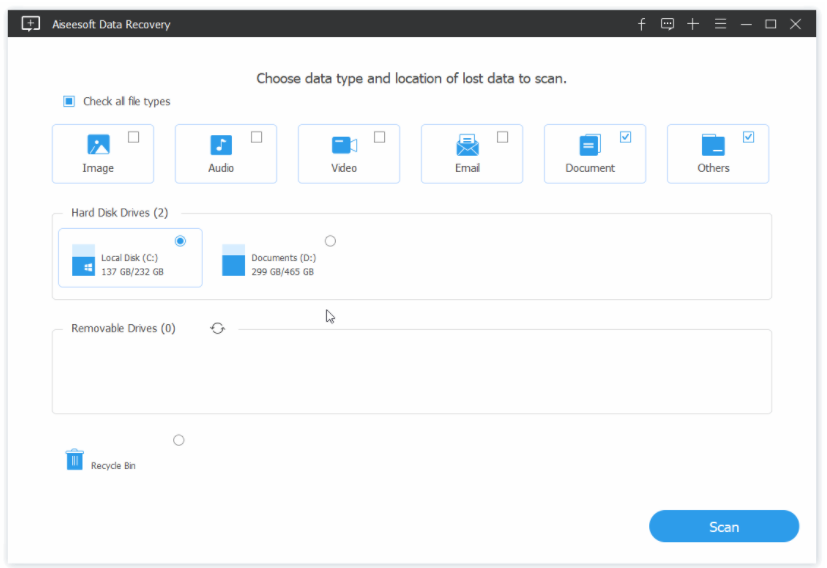 2、之后,弹出主界面。 选择您要恢复的文件类型。 它可以是图像,文档,电子邮件,视频,音频或任何其他图像。 然后,选择丢失的文件在磁盘驱动器中的位置。