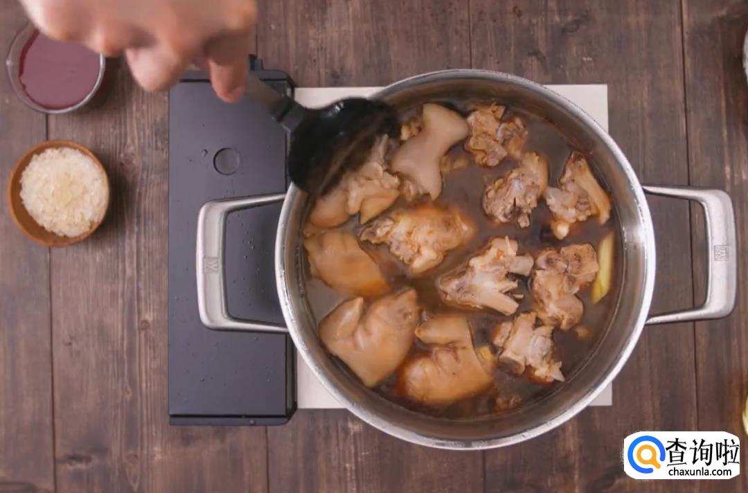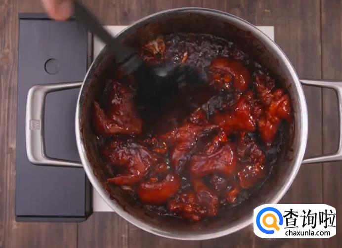 煮沸后加入南乳汁和冰糖搅拌均匀,汤汁再次煮沸后小火焖煮1小时,最后大火收汁即可。