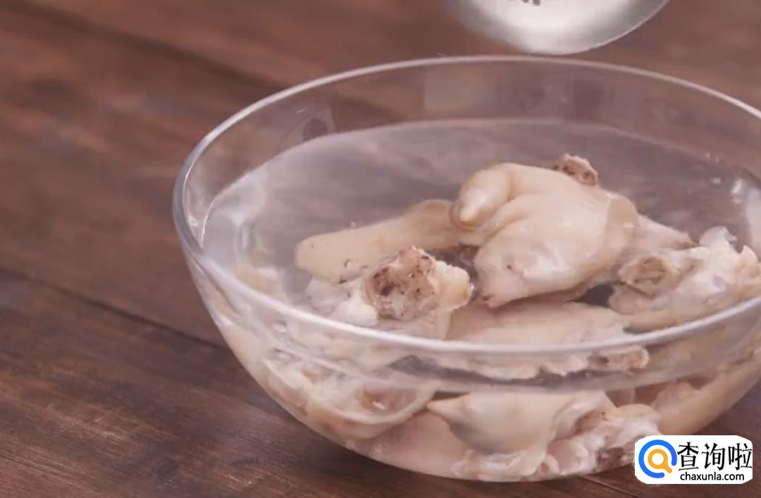 将猪手放入沸水中焯水,加入料酒,猪手腥味中,煮久一点,然后捞出冲洗一下备用。