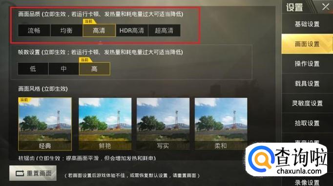 在右侧列表中点击进入“画面设置”分组,可以在“画面品质”中,选择并调节成自己想要的画质。