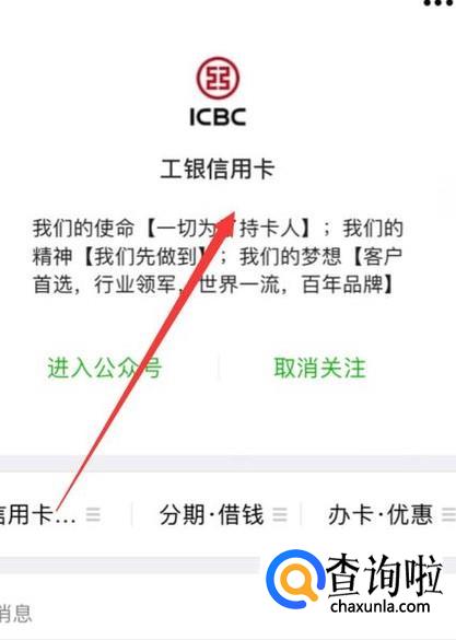 首先你要找到你所在行的微信公众号,在这里我以工银为例子,如下图。