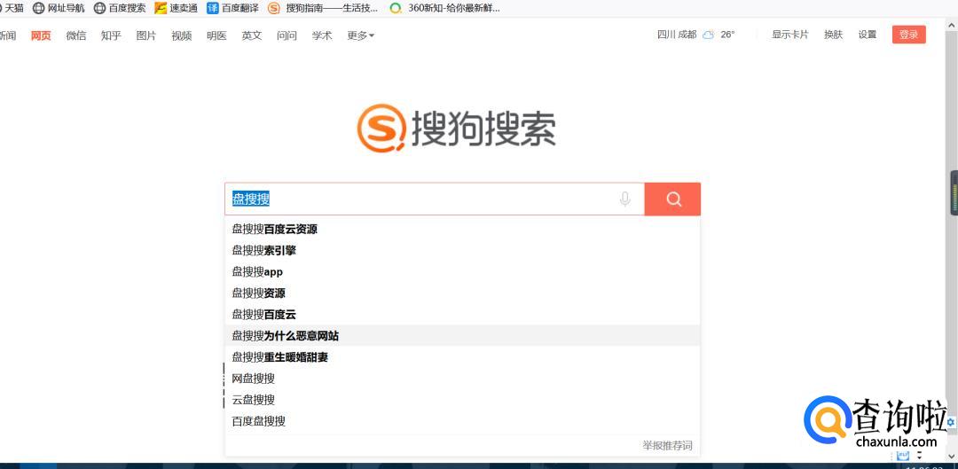 打开搜狗浏览器,输入框输入“盘搜搜”,点击“搜索”。