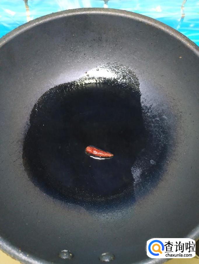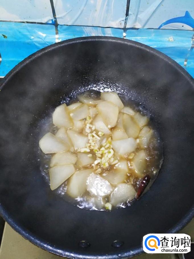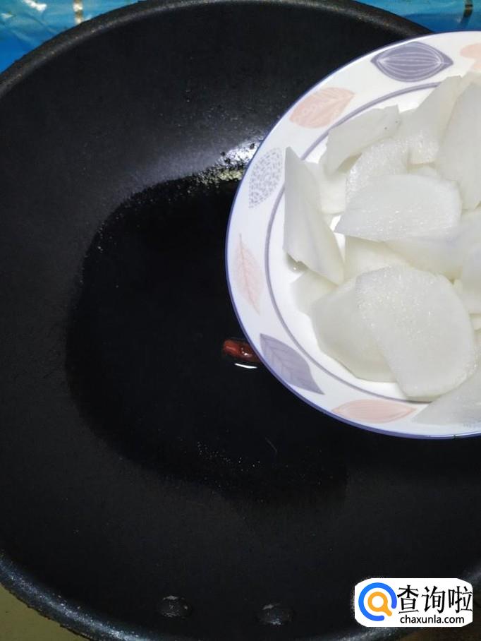 炒锅中放适量油,然后放入一个干辣椒炒香,将白萝卜块儿,倒入锅中,翻炒均匀。
