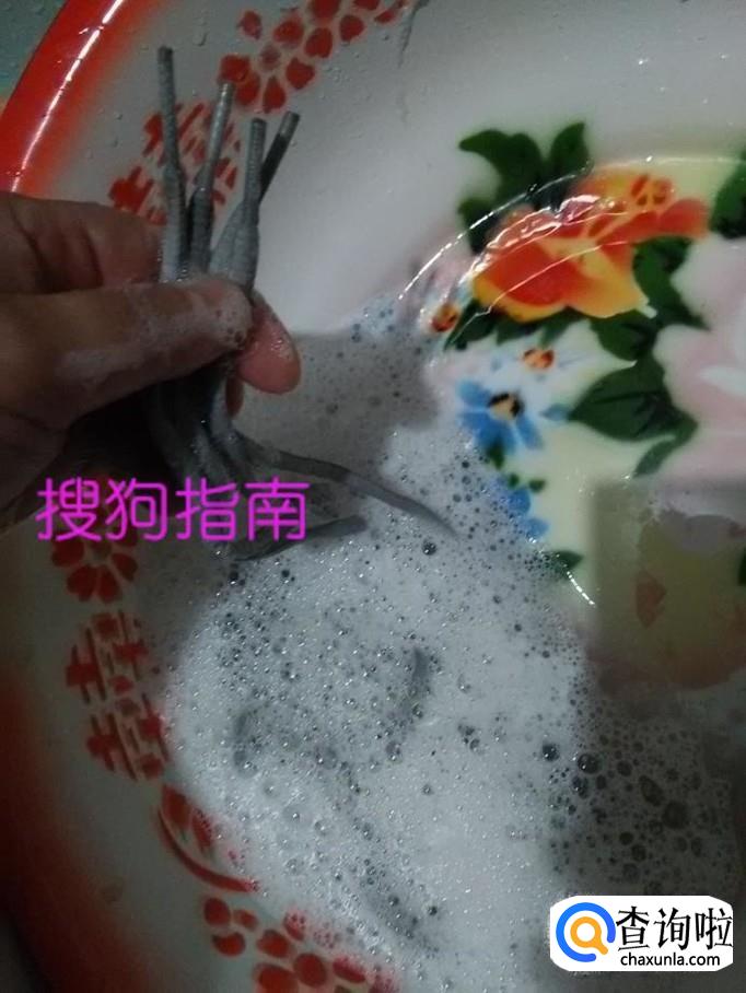 用手含有洗衣液的水搅起泡沫,将鞋带放入泡沫中浸泡一会儿。