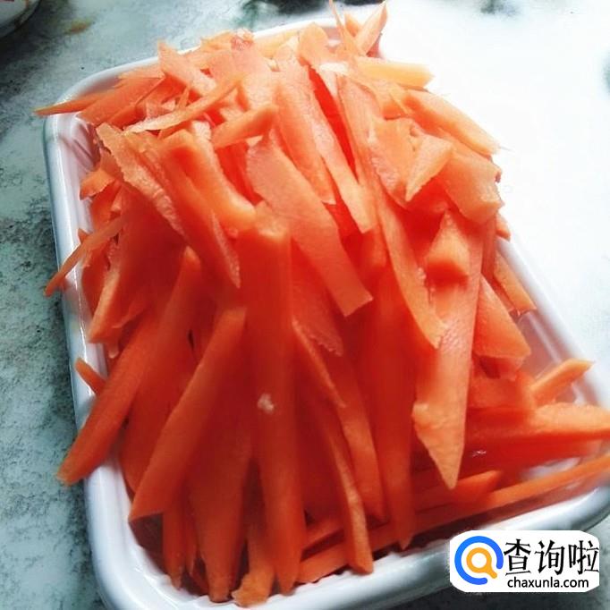 再把胡萝卜去皮切成丝,用来炒的,可以不用切得太细,